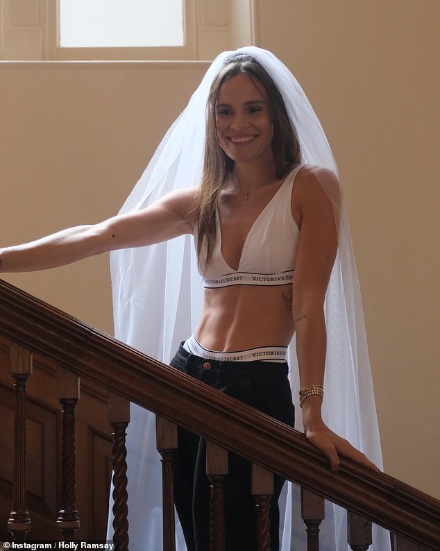 Clearly preparing for the moment she walked down the aisle, Holly also shared a pair of snaps in a bridal veil, while posing in a two-piece from Victoria’s Secret Bridal, with the capton: ‘iiit’s Wedding Month.’