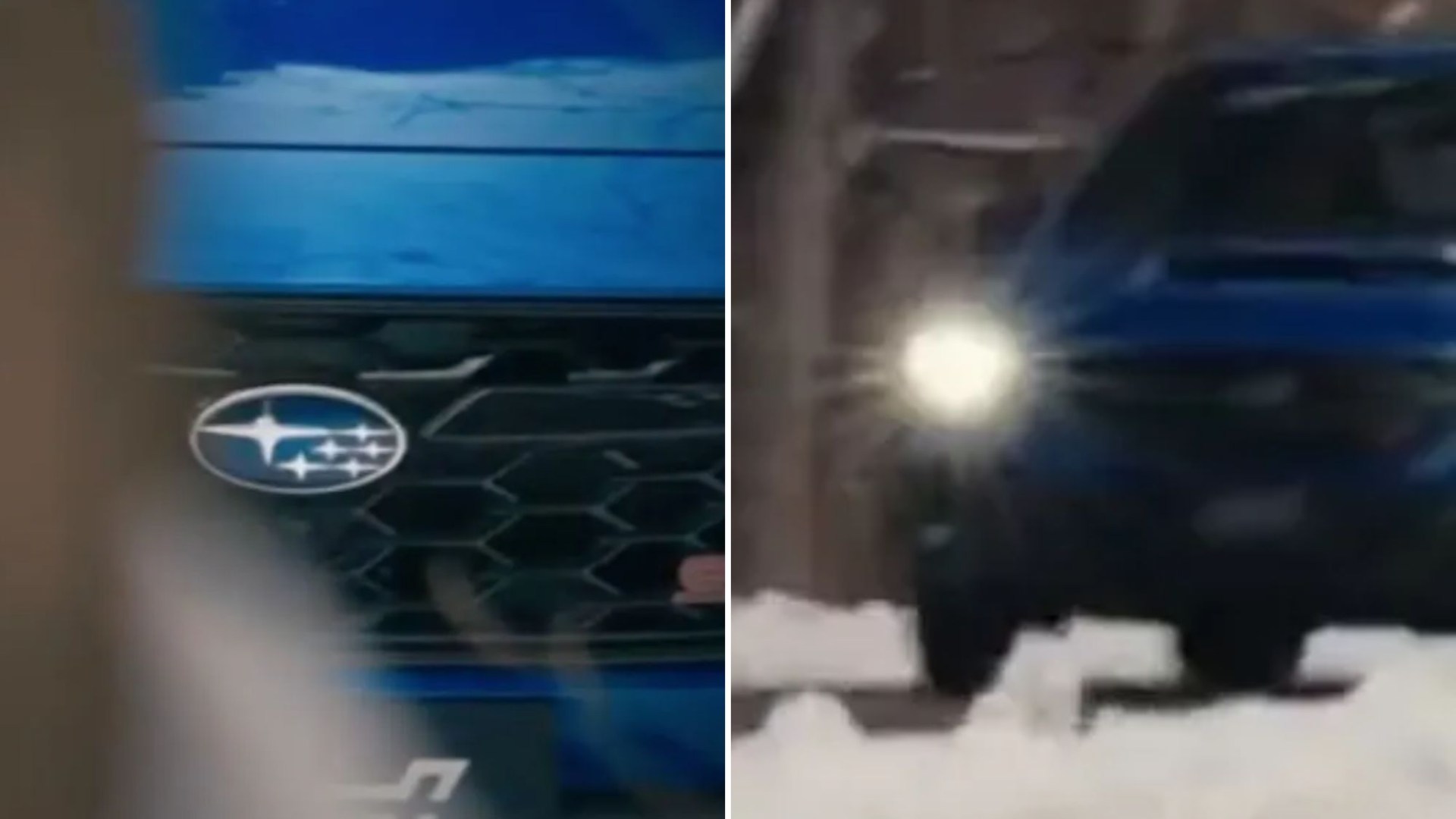 The 12‑second clip opens with an obscured blue WRX, but the STI badge on the grille is unmistakable.