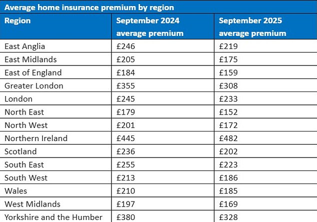 In the North West of England, homeowners typically forked out £172 for home insurance, down 14 per cent from £201 in September 2024.