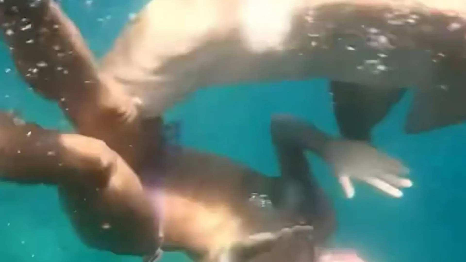 THIS is the terrifying moment a tourist was bitten by a shark that tried to drag her into the dark depths off the coast of Brazil.