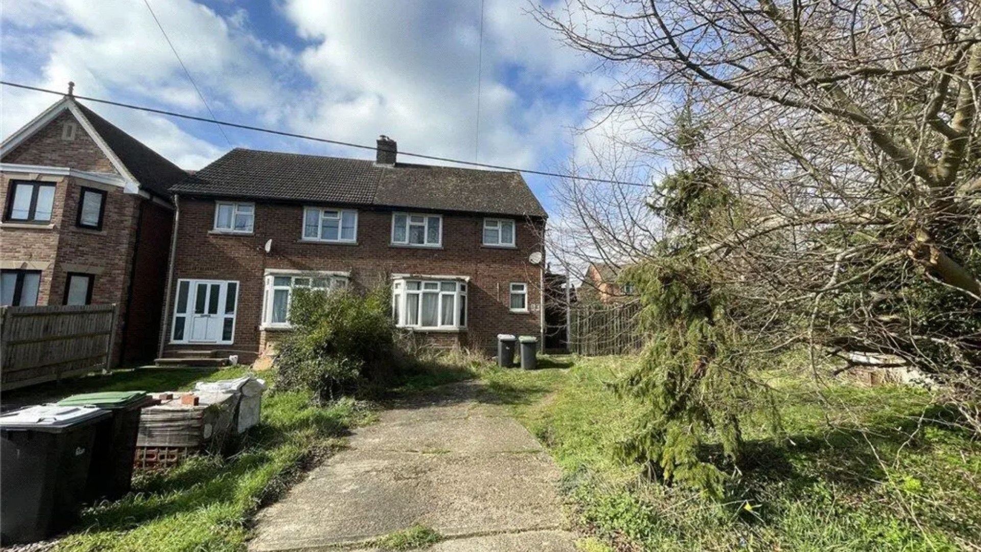 It reads: “Nicely located within the village, well set back from the road and benefiting from a long west-facing rear garden, this three-bedroom semi-detached house requires refurbishment.