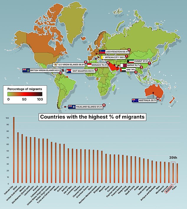 United Nations data from 2024 paints a stark picture of global movement with 304million people – or 3.07 per cent of the global population – residing outside their country of birth.