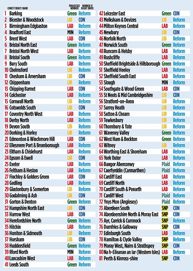 The Electoral Calculus study assumes deals are done in seats where Reform is ahead in the polls and the Tories are in third place or worse and vice-versa. It was then predicted that 80 per cent of votes would transfer between parties once one of them stood down.