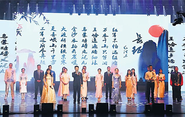 Christopher Cash (far right) and his friend Christopher Berry (far left) are pictured on stage at a school event in China where they were working as teachers
