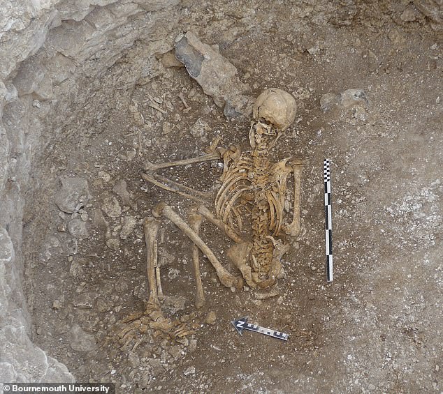 The excavation, at Winterborne Kingston, near Bere Regis, is headed by Dr Miles Russell, principal academic in Prehistoric and Roman Archaeology at Bournemouth University in Dorset, who told the Daily Mail: ‘We’re seeing some individual who’s been executed in front of an audience. It’s been done in a very theatrical way.’