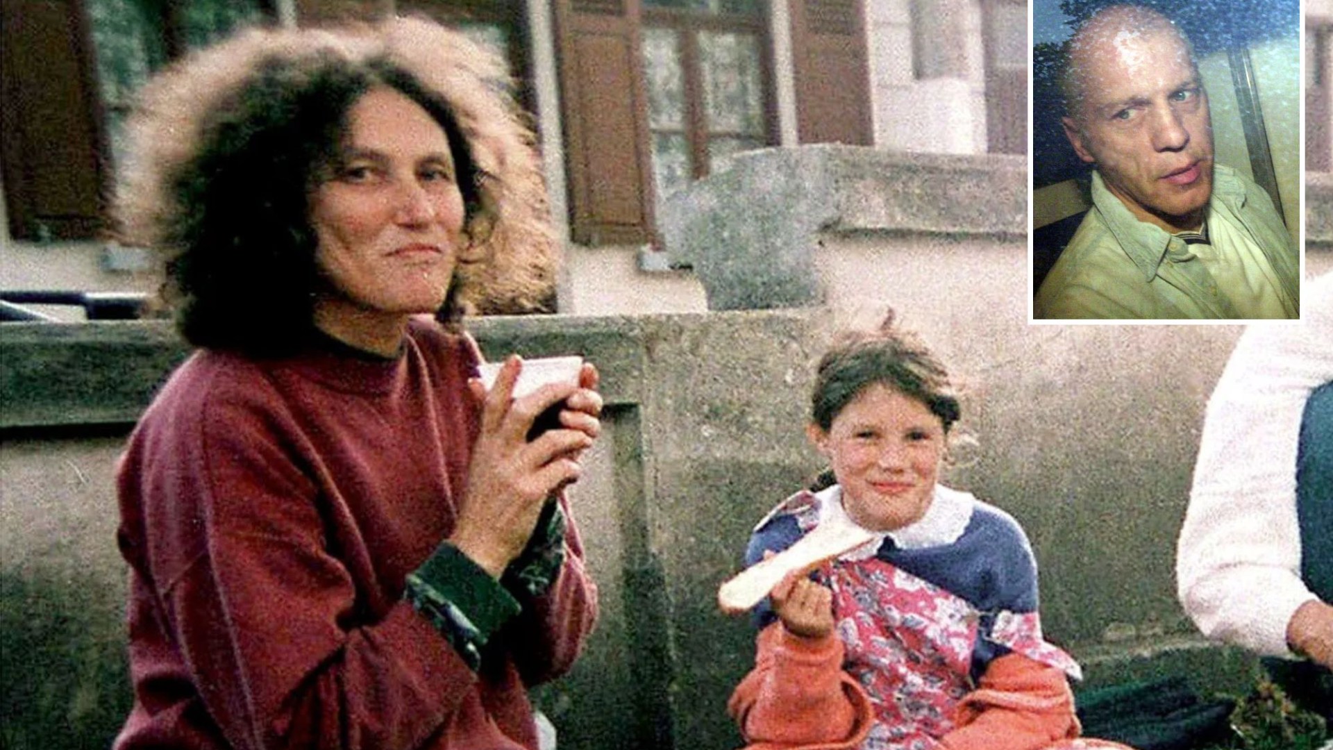 An image collage containing 2 images, Image 1 shows Lin, Josie, Shaun, and Megan Russell on a family picnic, Image 2 shows Michael Stone looking towards the viewer with a neutral expression