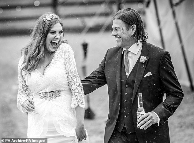 There was a touch of deja vu at play as handsome groom Sean Bean and his beaming wife, resplendent in an Alice Temperley bridal gown, posed for a tasteful monochrome photo moments after their intimate wedding ceremony (pictured)