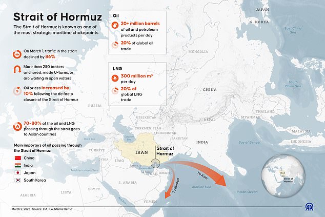 Iran’s Revolutionary Guard has threatened to ‘set ablaze’ any Western tanker that attempts to navigate the strait. Hundreds of ships laden with oil, as well as liquefied natural gas, have amassed either end of it.