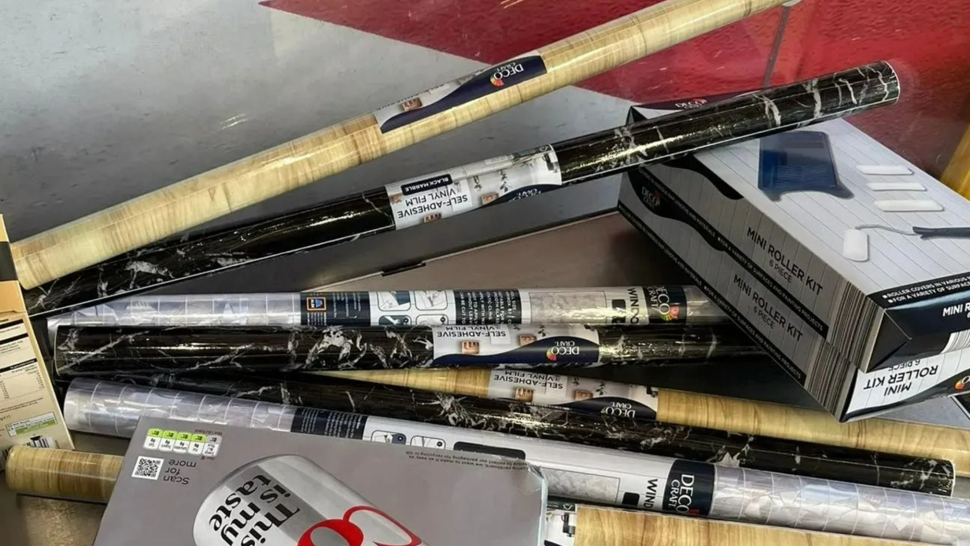 Alongside a picture of eight rolls of vinyl and a mini paint roller set, she wrote: “This all cost £3 in my Aldi – vinyl rolls 6p a roll and rollers 6p”.