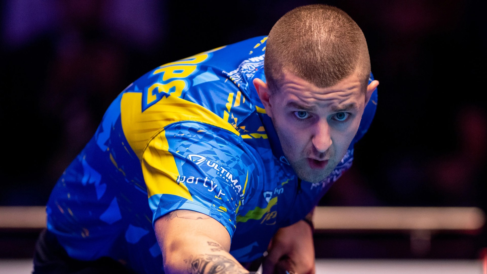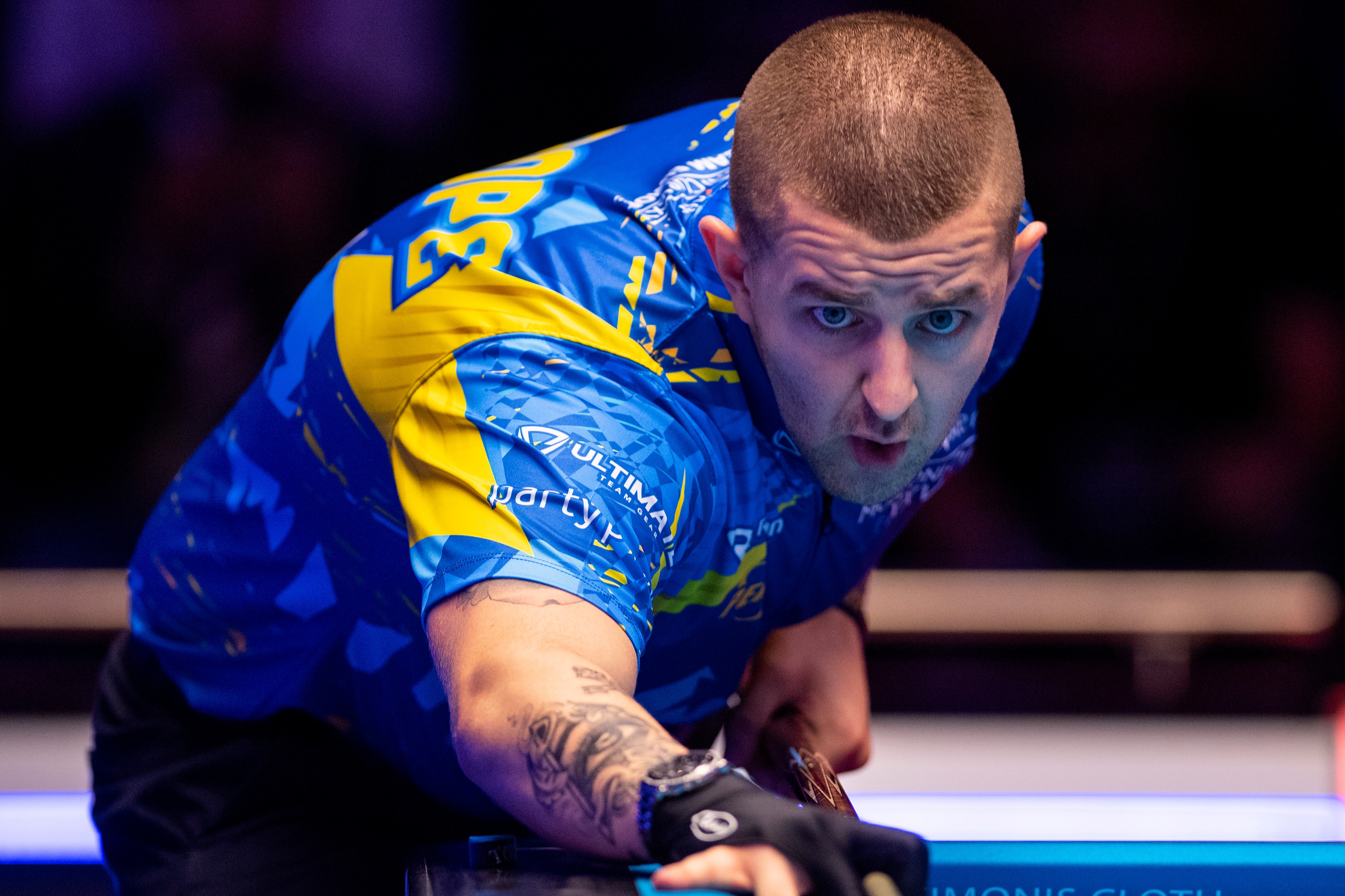 Jayson Shaw of Team Europe playing a shot in a game of pool.