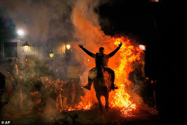 A man rides a horse through a bonfire as part of a ritual in honor of Saint Anthony the Abbot, the patron saint of domestic animals, in San Bartolome de Pinares, Spain, Friday, January 16, 2026