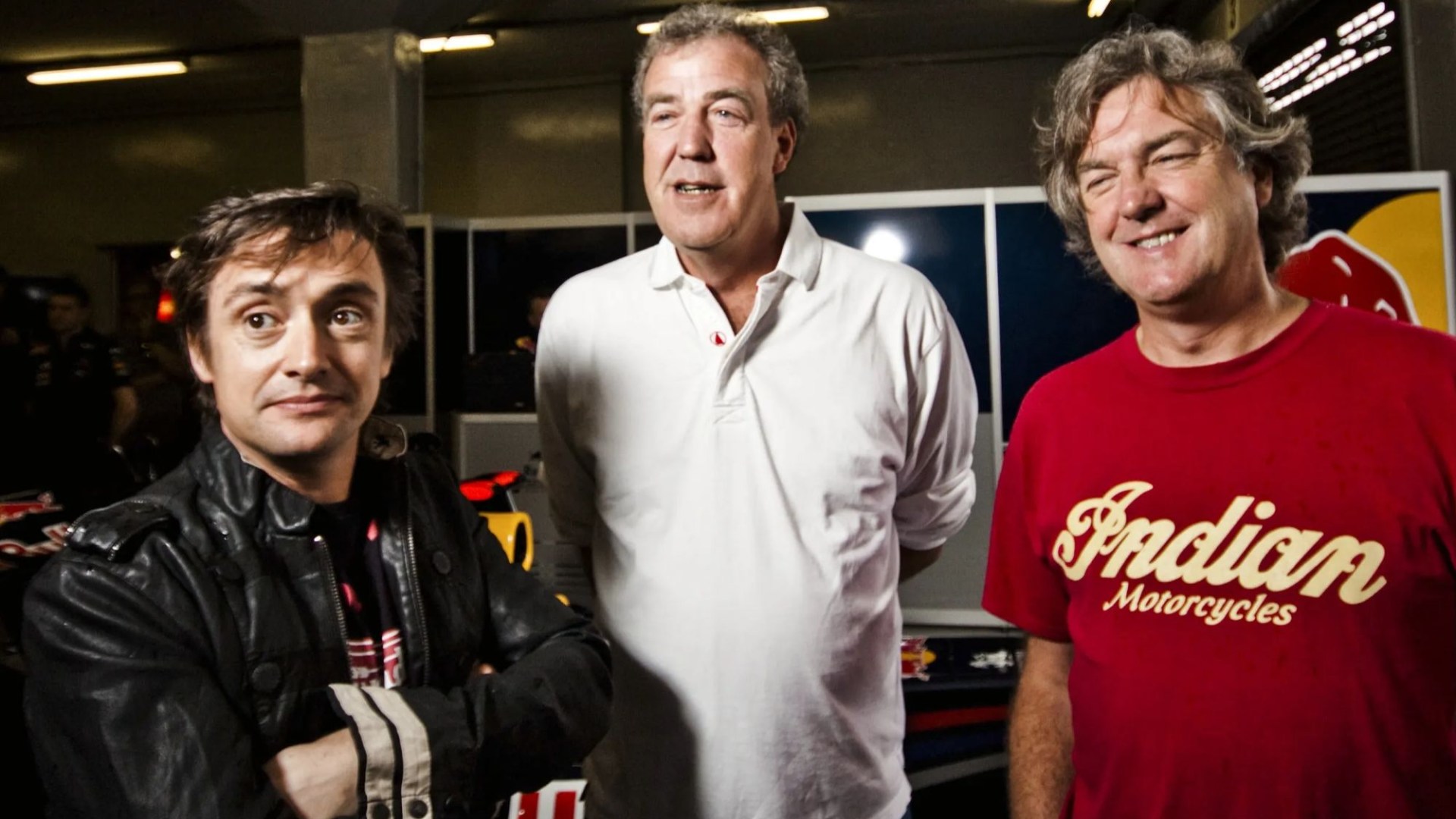 British TV personalities Richard Hammond, Jeremy Clarkson, and James May from Top Gear at the Kyalami Racetrack.