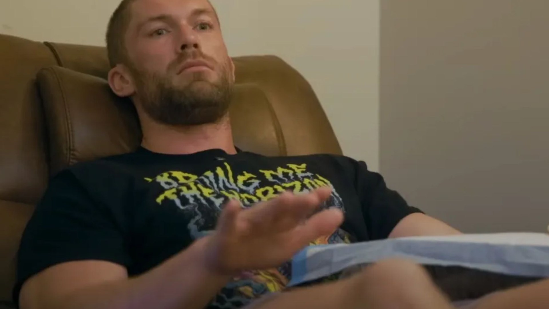 Chris Williamson reclines in a brown leather chair, wearing a black t-shirt, with medical equipment attached to his arm.