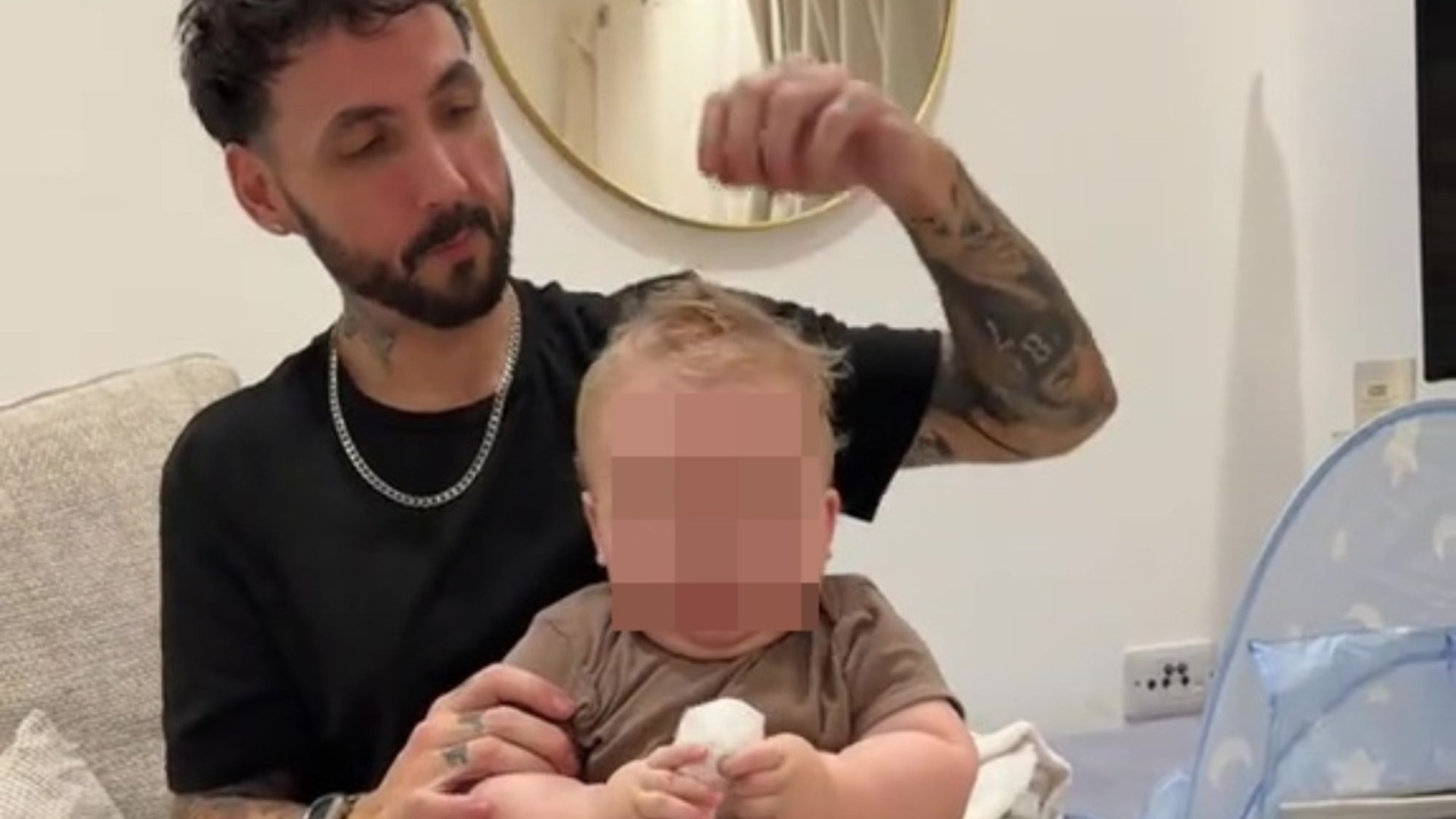 In the video, her son, who is now eight months old, could be seen sitting on his dad’s lap as he gave him a wipe down with baby wipes.