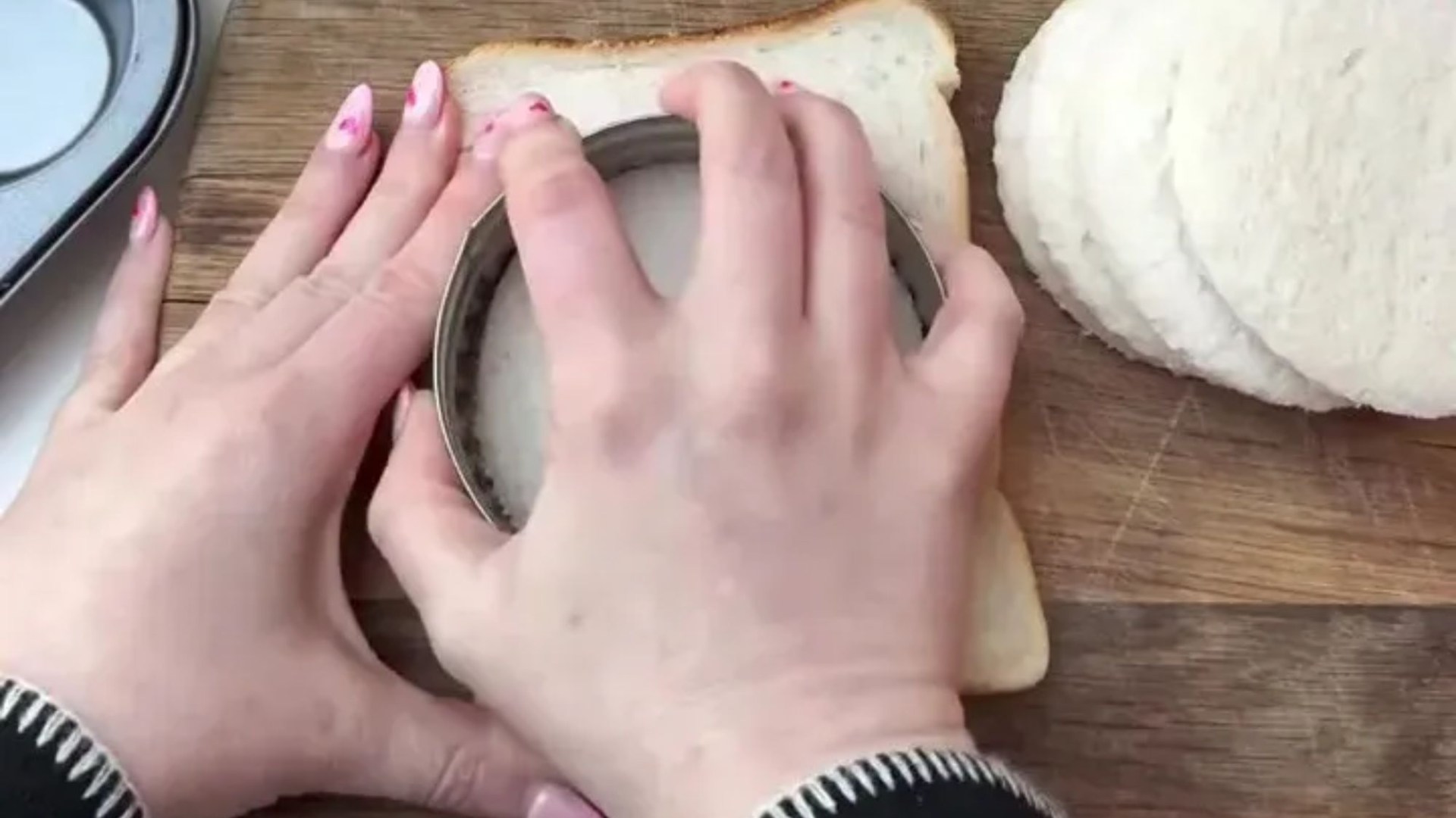 Using a cookie cutter, Casey starts by cutting circles from bread slices and then pushes them into cupcake baking trays with the end of a rolling pin.