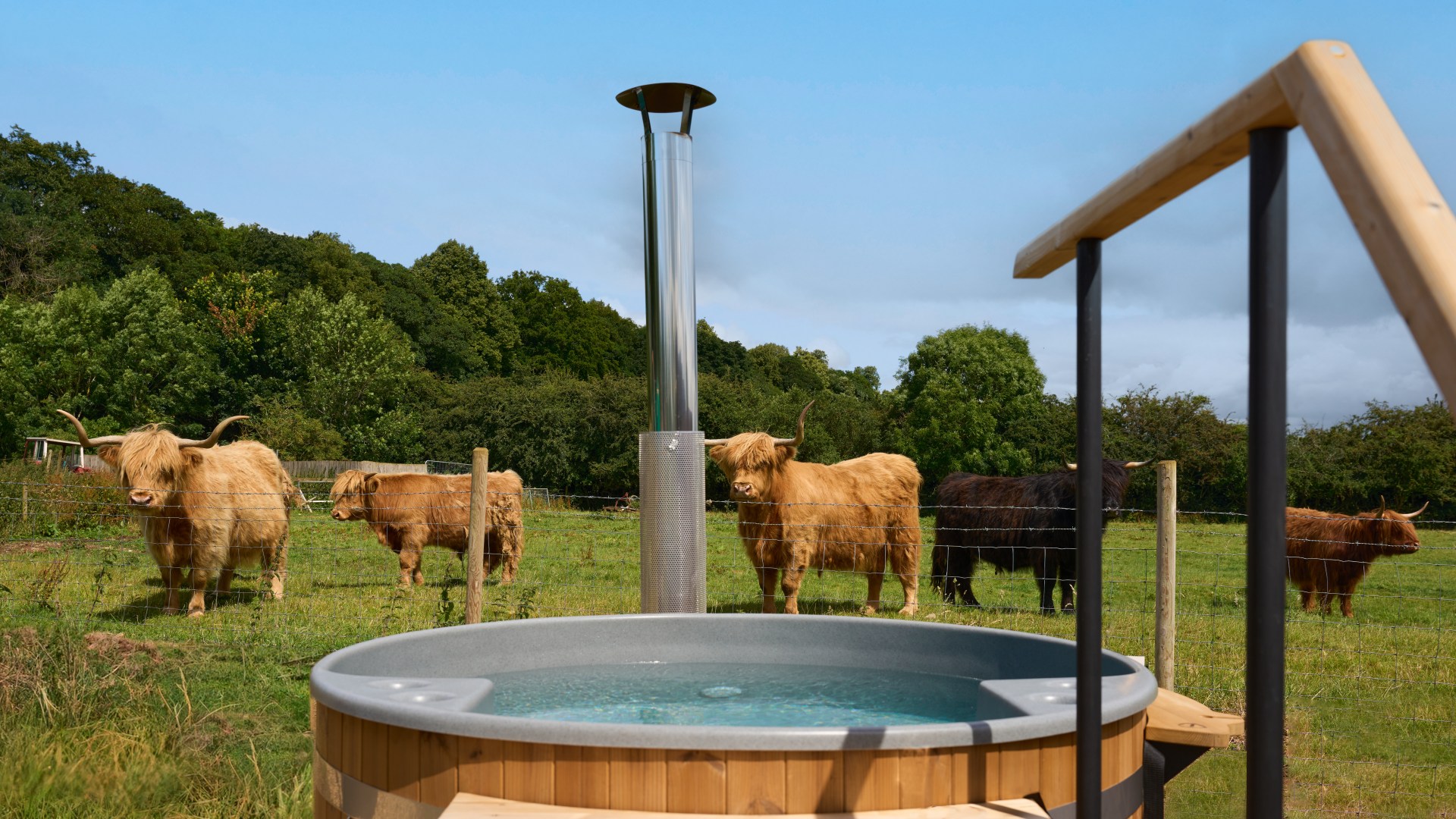People come for the outdoor Signet Spa where wood-fired hot tubs, a heated pool and a glass-walled sauna overlook fields of grazing Highland cows.