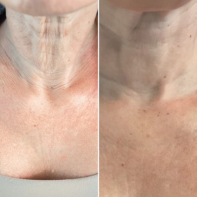 Olivia Falcon’s neck when she was on Ozempic (left) and after deploying her top tips to rid the saggy skin (right)
