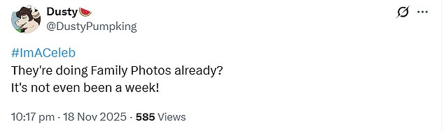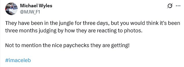 ‘They have been in the jungle for three days, but you would think it’s been three months judging by how they are reacting to photos. Not to mention the nice paychecks they are getting!’;