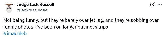 ‘Not being funny, but they’re barely over jet lag, and they’re sobbing over family photos. I’ve been on longer business trips’.