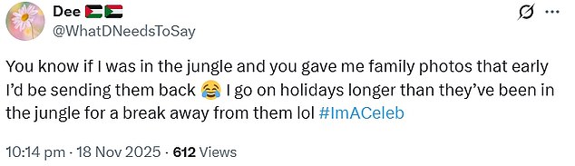 ‘You know if I was in the jungle and you gave me family photos that early I’d be sending them back. I go on holidays longer than they’ve been in the jungle for a break away from them’;