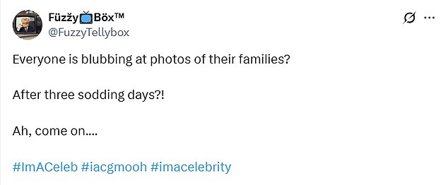 Fans took to X to vent their fury, after Kelly Brook, 45, and Lisa Riley, 49, sobbed over missing their loved ones after just three days in the jungle.