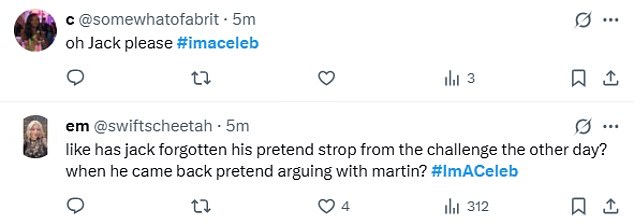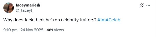 Amused fans took to X after watching the scenes, joking Jack has mistook I’m A Celebrity for Celebrity Traitors.