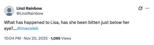 ‘What has happened to Lisa, has she been bitten just below her eye?’, while another added: ‘Guys, I am worried about Lisa, the bugs have really got her.’