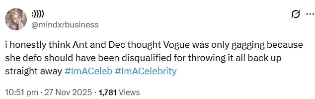 ‘I honestly think Ant and Dec thought Vogue was only gagging because she defo should have been disqualified for throwing it all back up straight away.’