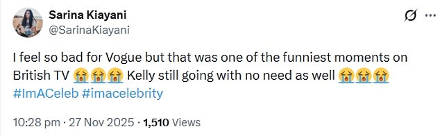 ‘I feel so bad for Vogue but that was one of the funniest moments on British TV. Kelly still going with no need as well.’
