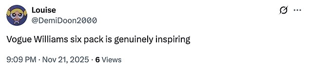 Fans took to X to obsess over the presenters jaw-dropping figure and wrote: ‘Vogue Williams six pack is genuinely inspiring’, ‘Vogue williams is #fit’.