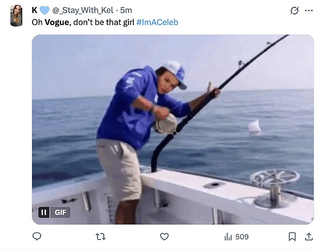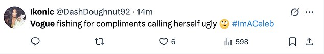 ‘Eww put me right off her #ImACeleb vogue pretending that she’s unattractive’, ‘Vogue fishing for compliments calling herself ugly #ImACeleb’.