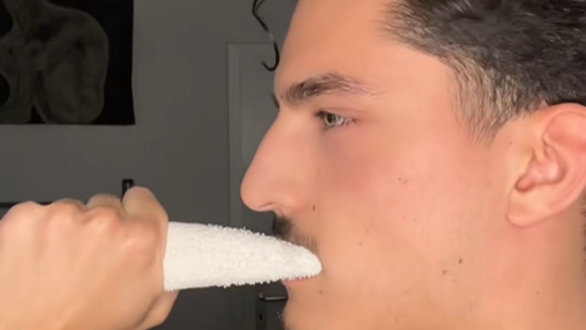 Adix demonstrates how people can bite down on a rolled up, damp towel and clench for up to 15 seconds to strengthen up the jaw muscles.