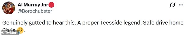 Fans penned: ‘Genuinely gutted to hear this. A proper Teesside legend. Safe drive home Chris… Damn… he lived for his cars, wonderful guitarist, and made so many great albums. RIP Chris Rea… Aah no! Bad news…