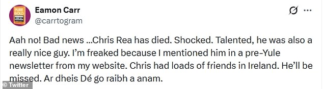 ‘Chris Rea has died. Shocked. Talented, he was also a really nice guy. I’m freaked because I mentioned him in a pre-Yule newsletter from my website. Chris had loads of friends in Ireland. He’ll be missed. Ar dheis Dé go raibh a anam…