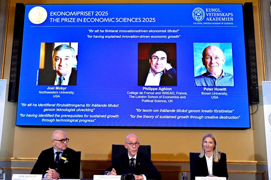 Every few years, the Nobel Memorial Prize in Economic Sciences goes to thinkers who offer fresh insights on the sources of economic progress. A good example is this year’s award – or rather, awards – announced on Monday. They were given to three people: two with a theory about progress – “creative destruction” – and another who points to a “culture of growth.” Given this long record of Nobels, there appears no end to the idea that ideas on progress have no end.