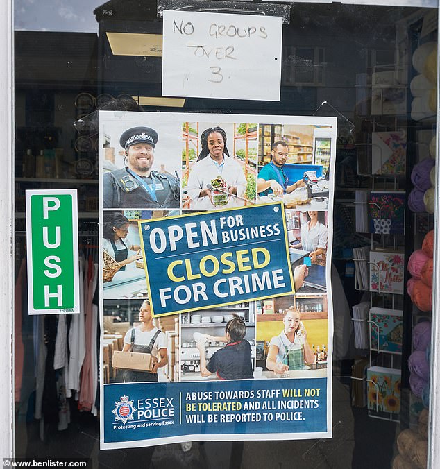 Braintree’s Sue Ryder charity shop, raising money for end of life care, now has a ‘no groups over three’ sign plastered on its front door above a poster reading: ‘Open for business, closed for crime.’