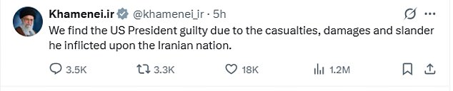Posting on X, Khamenei said: ‘We find the US President guilty due to the casualties, damages and slander he inflicted upon the Iranian nation’