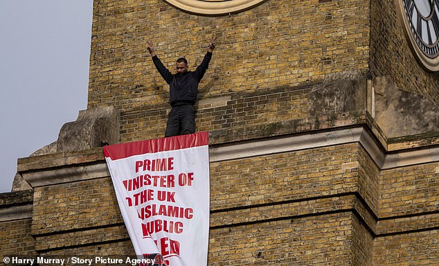 The protester raised his arms after securing the banner in place, which criticised the UK Government’s response to the Iranian regime’s murder of thousands of protesters