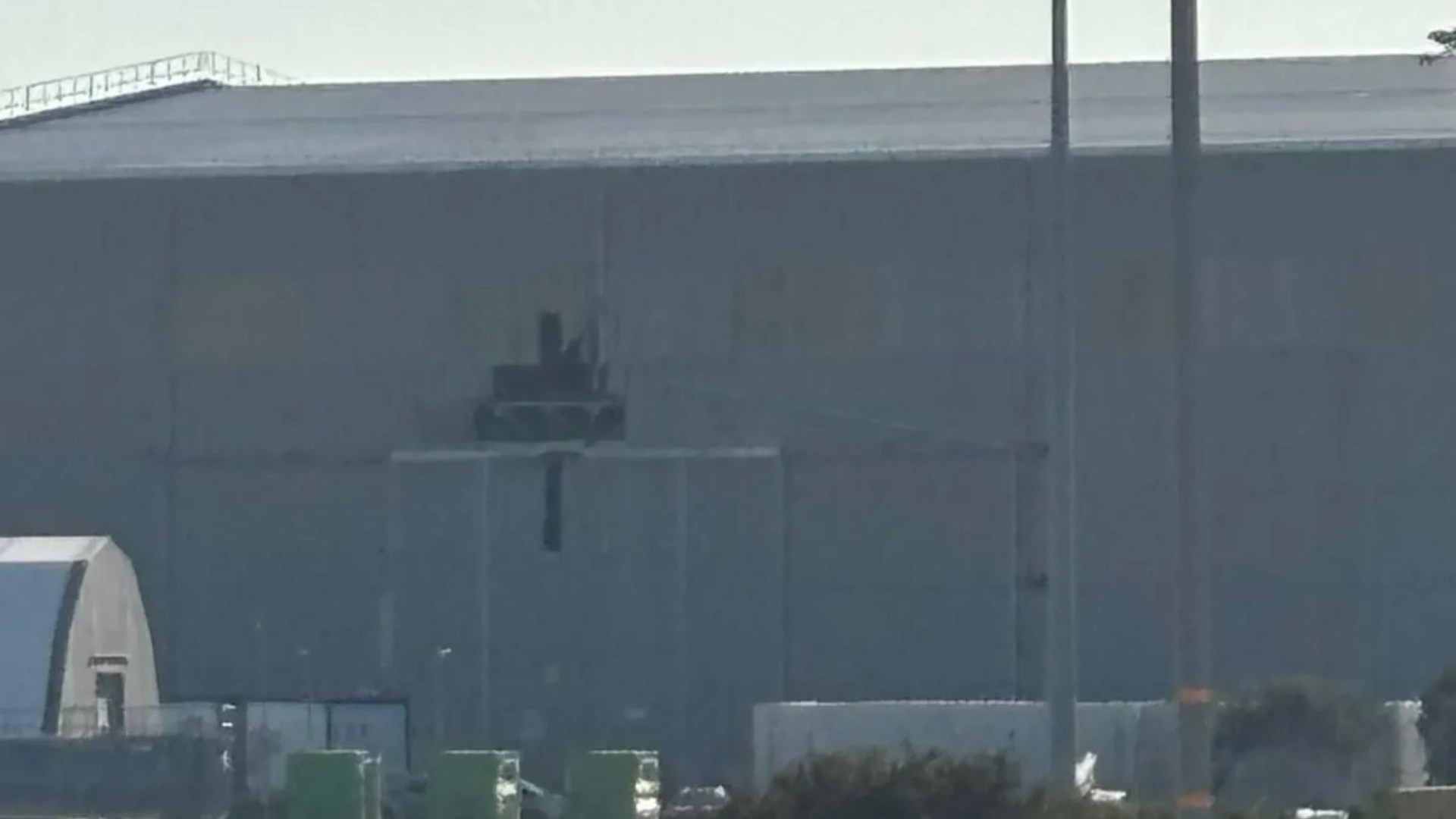 But the photograph obtained by The Sun shows a tear at least 30ft long and 20ft wide in the western side of the hangar.