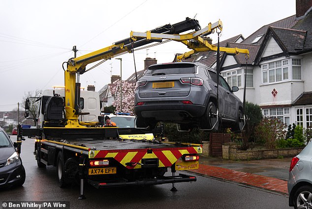 The Mail understands that the cell had been under surveillance for months, but officers decided to accelerate their arrest plans due to the escalating crisis in the Middle East. Pictured: A car is removed from an address in Finchley, north London