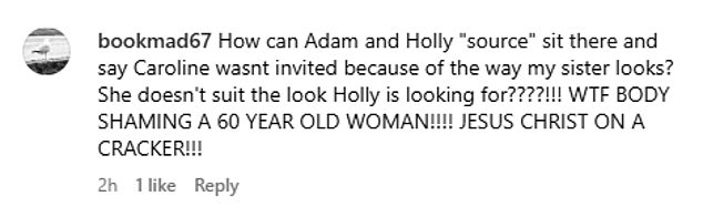 Adam’s auntie Louise Williams, wrote: ‘How can Adam and Holly ‘source’ sit there and say Caroline wasn’t invited because of the way my sister looks?