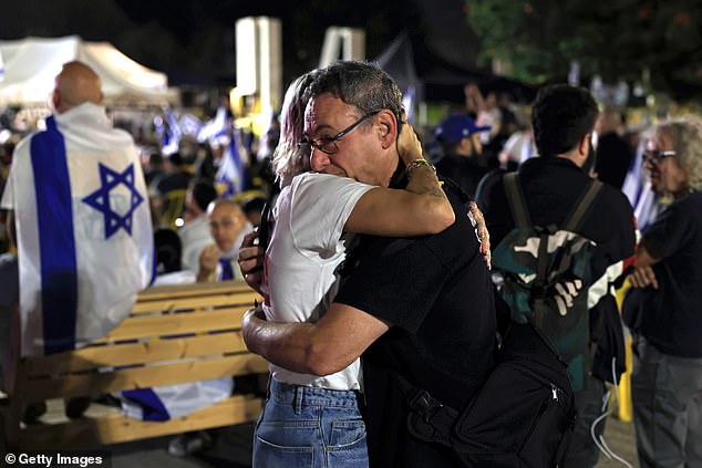 People embrace while waiting for the start of the hostage release live stream at Hostages Square on October 13, 2025 in Tel Aviv, Israel