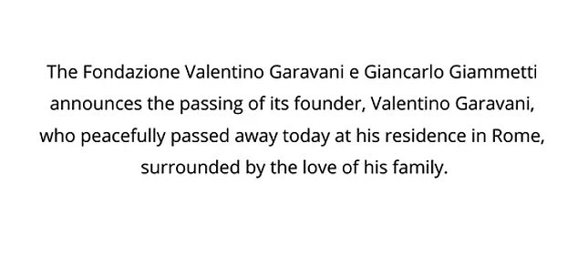 The statement read:’ The foundazione Valentio Garavani e Giancarlo Giametti announces the passing of its founder, Valentino Garvani, who peacefully passed away today at his residence in Tome, surrounded by his family’.