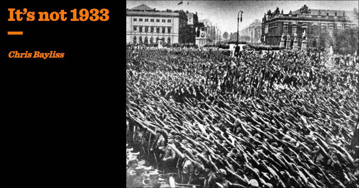 “Make Germany Great Again” is reasonably close enough to Nazi rhetoric that we can let it pass, even though it isn’t a direct translation of Hitler. However that kind of rhetoric was absolutely universal across swathes of the German political spectrum during years after the First World War. It was very obviously a country that had been laid low and was in a reduced state compared to that of a generation previously.