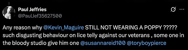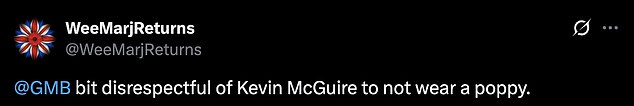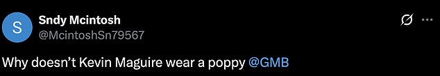 A third wrote: ‘Kevin McGuire still NOT wearing a poppy. What a utter disgrace to those veterans. Why is he not wearing one for the 2nd day I’ve noticed.’
