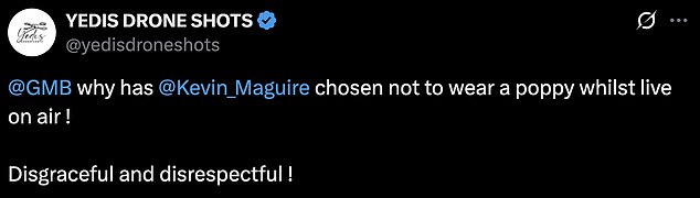 A fourth fumed: ‘The only one on GMB not wearing a poppy!’ as a fifth added: ‘Any reason why Kevin McGuire STILL NOT WEARING A POPPY ????? Such disgusting behaviour on lice telly against our veterans.’