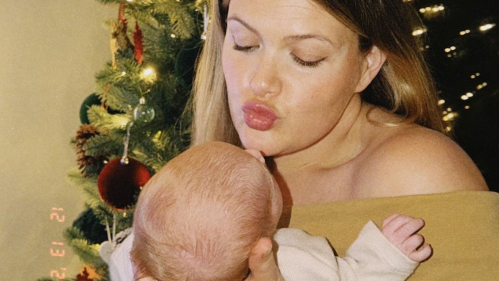She posted a series of photos of her tenderly holding her newborn daughter in her living room while sat in front of a Christmas tree.