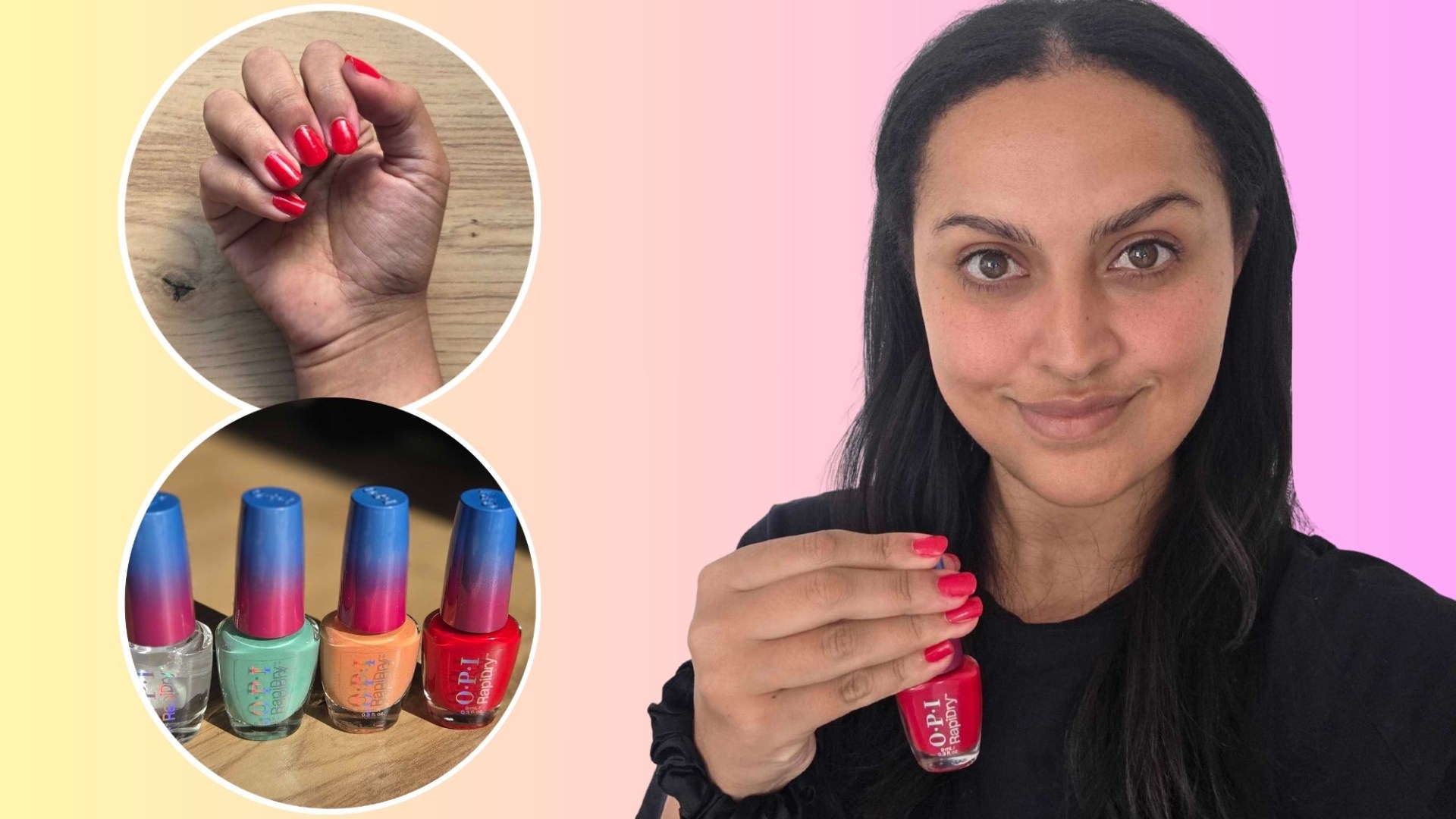 Collage of a woman wearing red OPI nail polish, a close-up of a hand with red OPI nail polish, and four bottles of OPI Rapid Dry nail polish.