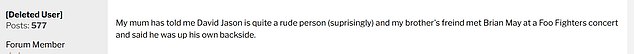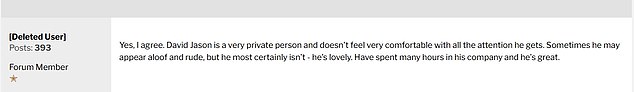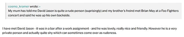 Another remarked: ‘I have met David Jason – it was in a bar after a work assignment – and he was lovely, really nice and friendly.