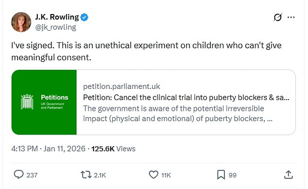 J.K. Rowling has thrown her support behind a petition opposing a proposed NHS trial of puberty blockers, describing it as ‘an unethical experiment on children who can’t give meaningful consent’.